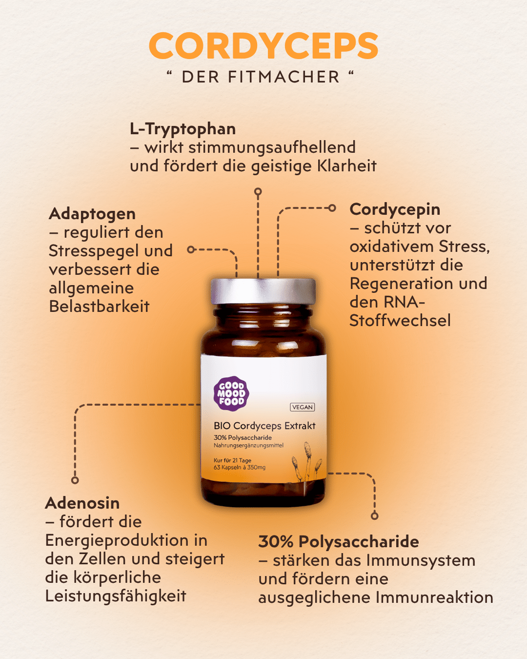 Den Cordyceps nehme ich durchgehend als Kur, weil ich damit konstant Energie, Fokus und eine gute Erholung spüre. An intensiveren Tagen oder in Phasen, in denen ich mehr Umfang habe, ergänzt er meine Ernährung auf sinnvolle Weise. Der Extrakt enthält einen hohen Anteil an Polysacchariden, die für die Wirkung des Pilzes wichtig sind, kombiniert mit bioaktiven Bestandteilen, die den Stoffwechsel und die Leistungsfähigkeit unterstützen.