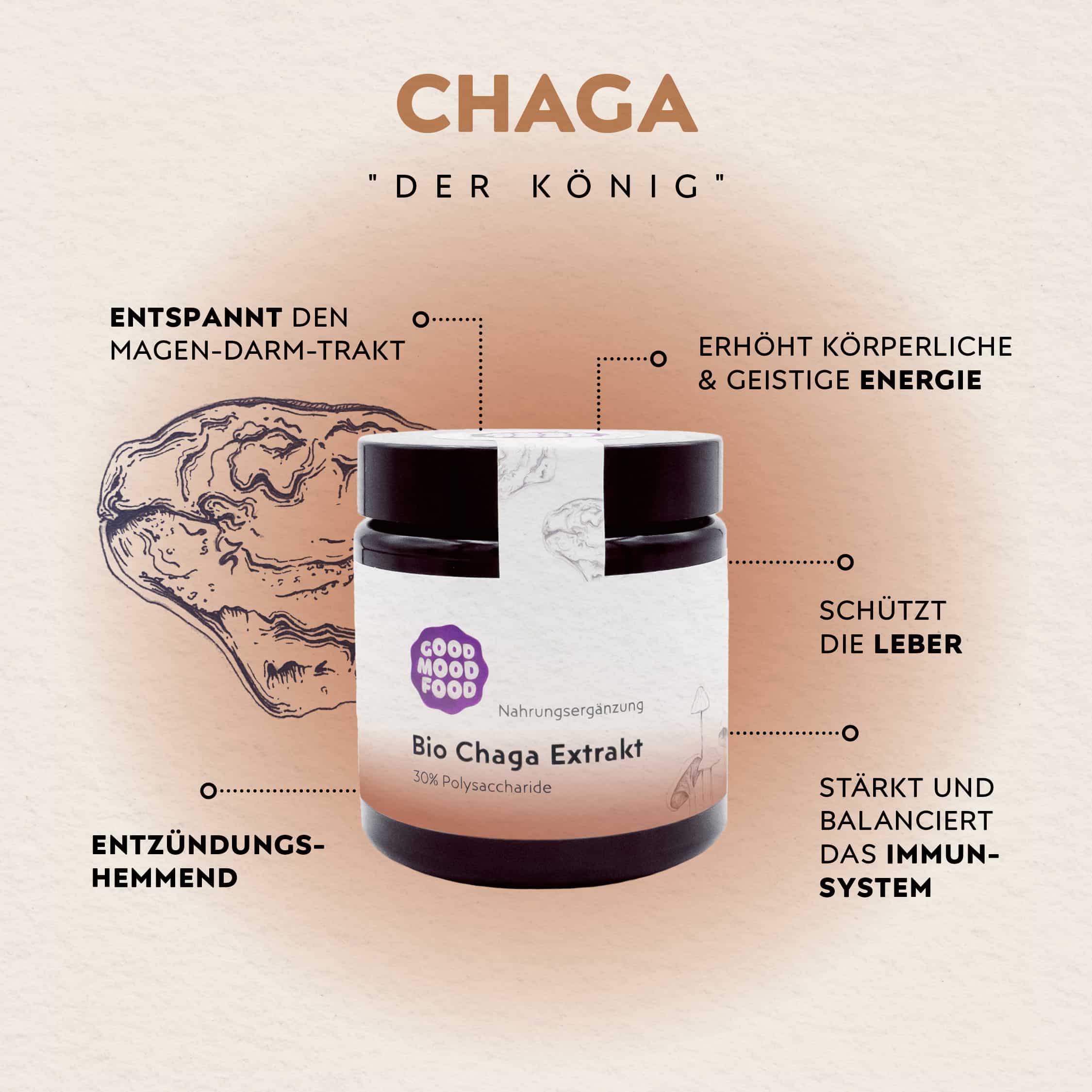 Unser Chaga wird wildgesammelt, schonend verarbeitet und zu einem hochkonzentrierten Extrakt mit 30 % Polysacchariden veredelt – ausschließlich aus dem Fruchtkörper und ohne Zusätze.