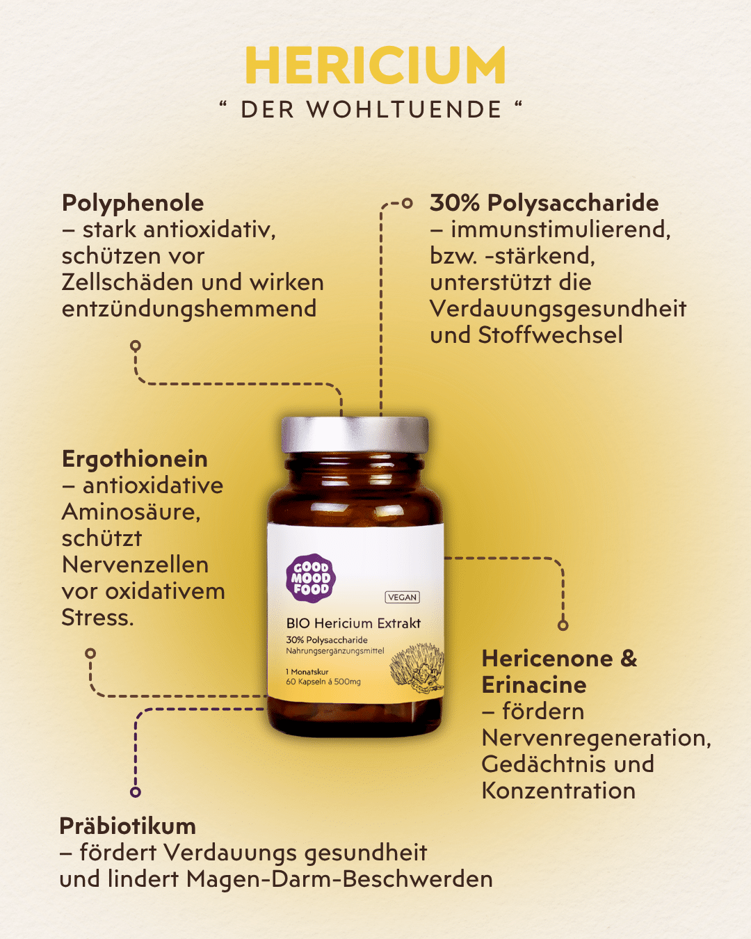 Mit seiner weichen, korallenartigen Form und seinem milden, fast meeresfruchtartigen Aroma ist er auch als Speisepilz geschätzt. In der modernen Ernährung wird Hericium vor allem für bewusste Lebensphasen eingesetzt – z. B. wenn es um Fokus, Ernährungsausgleich oder mentale Klarheit geht.