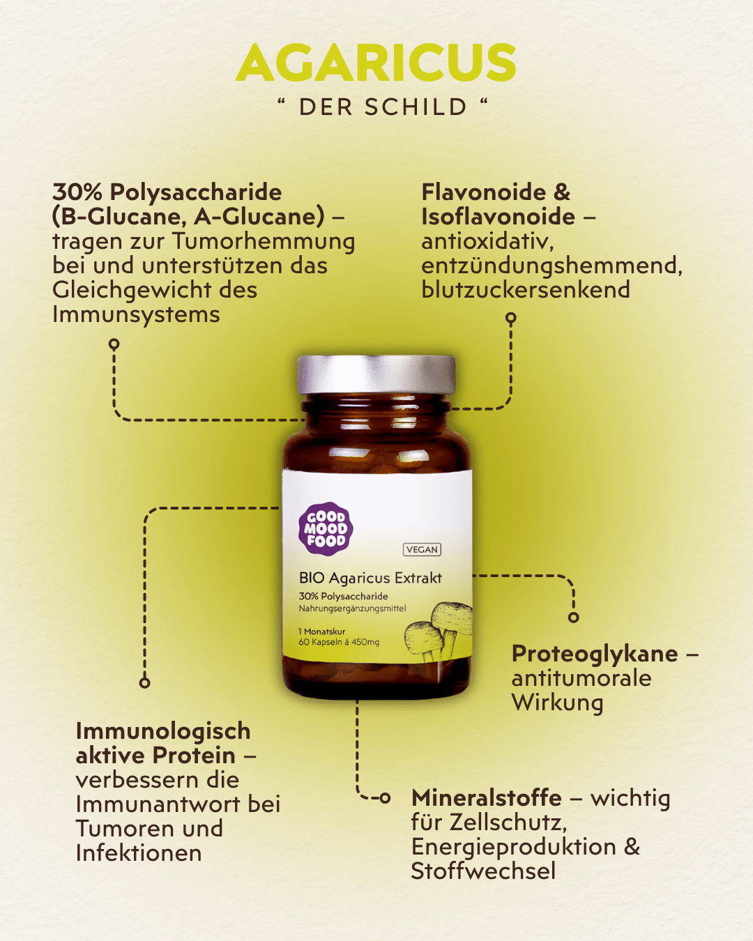 Mit 30 % Polysacchariden liefern sie das Beste aus dem Pilz in reiner, konzentrierter Form – ohne Füllstoffe, Zusatzstoffe oder tierische Bestandteile.