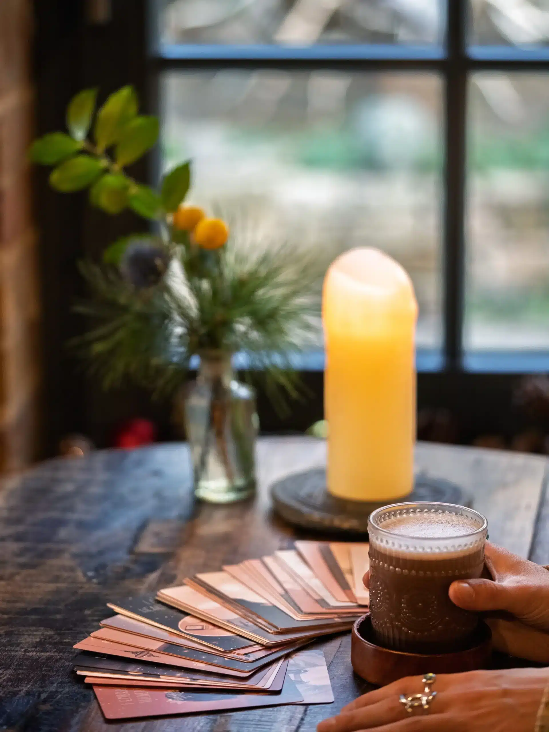 In Kombination mit einer Tasse warmem Kakao entsteht daraus ein ganzheitliches Ritual: Du kommst im Körper an, beruhigst deinen Geist und stärkst dein Herz – Schluck für Schluck, Karte für Karte.
